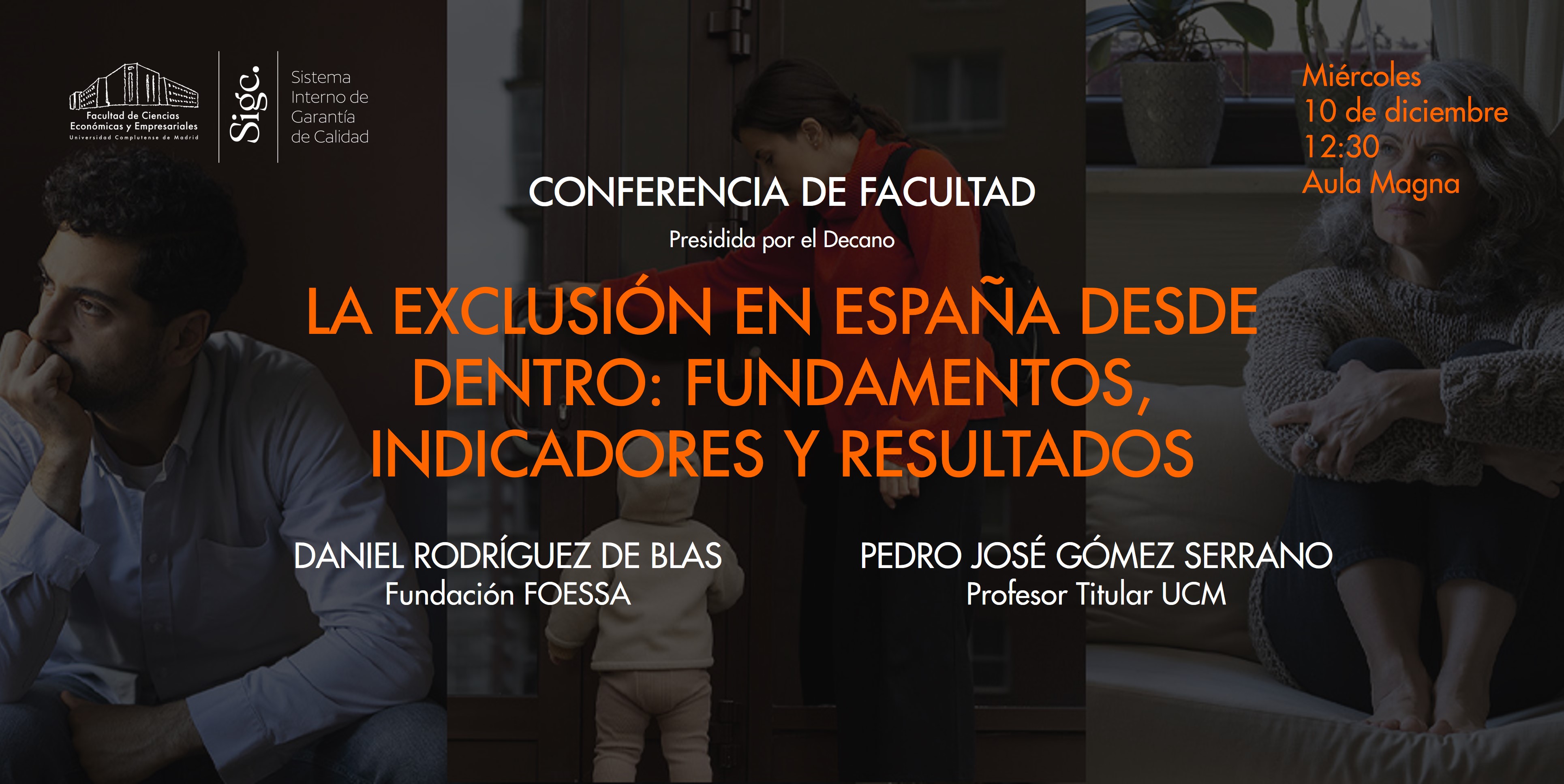 La próxima Conferencia de Facultad nos pone frente a una realidad incómoda "La exclusión en España desde dentro: fundamentos, indicadores y resultados" traídos de la manos de Daniel Rodríguez de Blas: Fundación FOESSA y Pedro José Gómez Serrano: Profesor Titular del Departamento de Economía Aplicada, Estructura e Historia UCM.