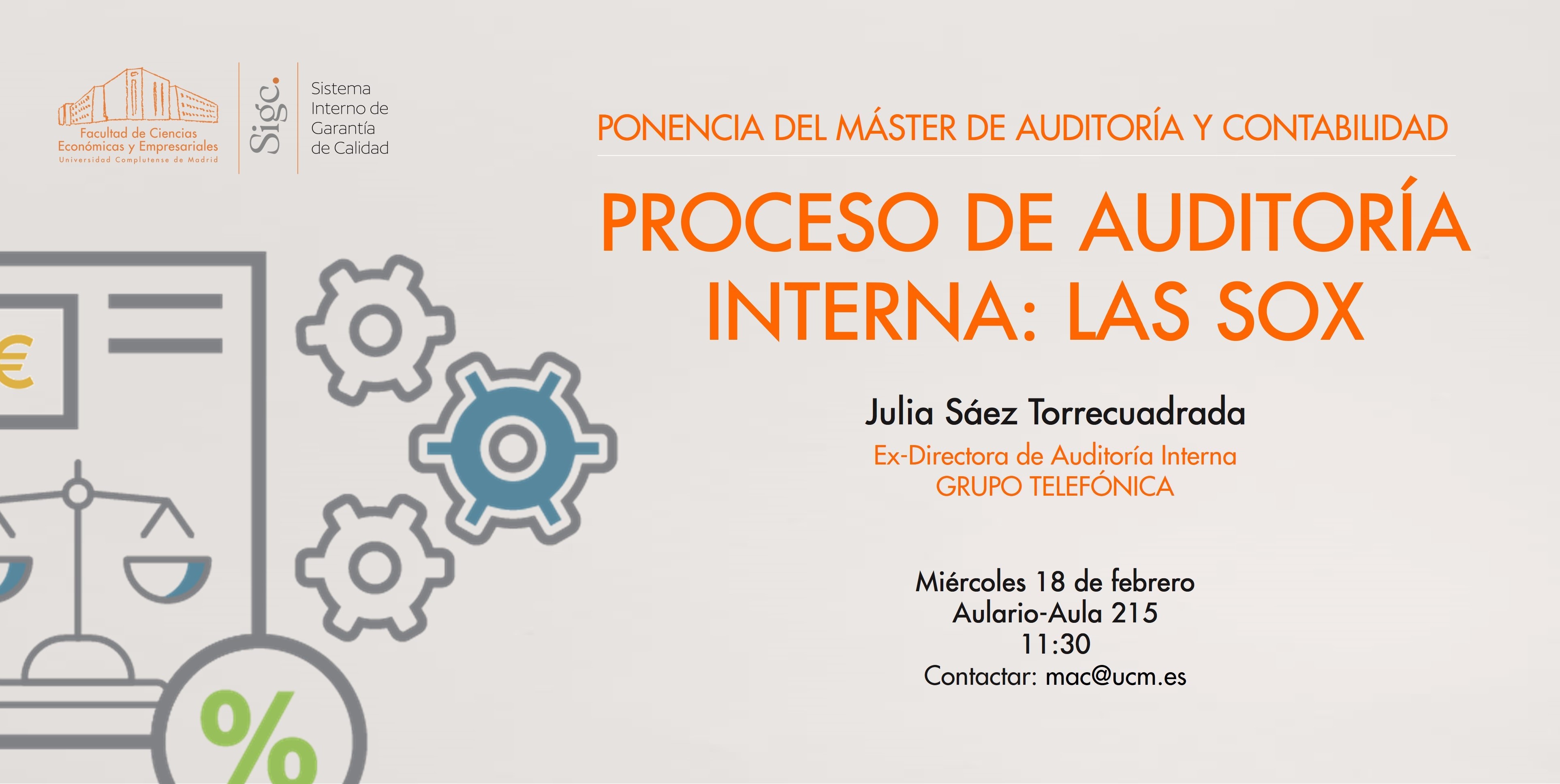 El Máster de Auditoría y Contabilidad (MAC), organiza la ponencia "Proceso de Auditoría Interna: Las SOX" para todos los alumnos de Grado y Master.